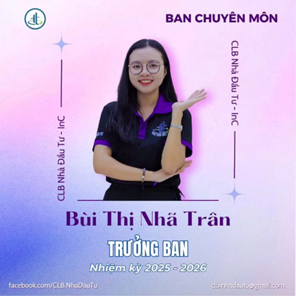 | 3. Bùi Thị Nhã Trân Chức vụ: Trưởng Ban Chuyên Môn Số ĐT: 0329926965 MSSV: 2221003305 Email: 2221003305@sv.ufm.edu.vn |