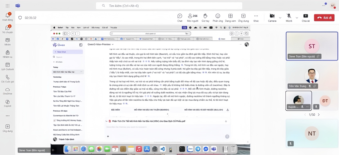 Cũng tại buổi báo cáo chuyên đề, các sinh viên tích cực trao đổi với diễn giả về các chủ đề: tiềm năng và giới hạn của AI trong phân tích đầu tư, đạo đức sử dụng AI, chiến lược nghề nghiệp trong ngành môi giới, cũng như yêu cầu kỹ năng cần thiết trong thời gian tới. Các câu trả lời sâu sắc, gắn liền với thực tiễn từ diễn giả đã giúp sinh viên củng cố kiến thức, mở rộng tư duy và có định hướng cụ thể cho học tập và nghề nghiệp trong tương lai.