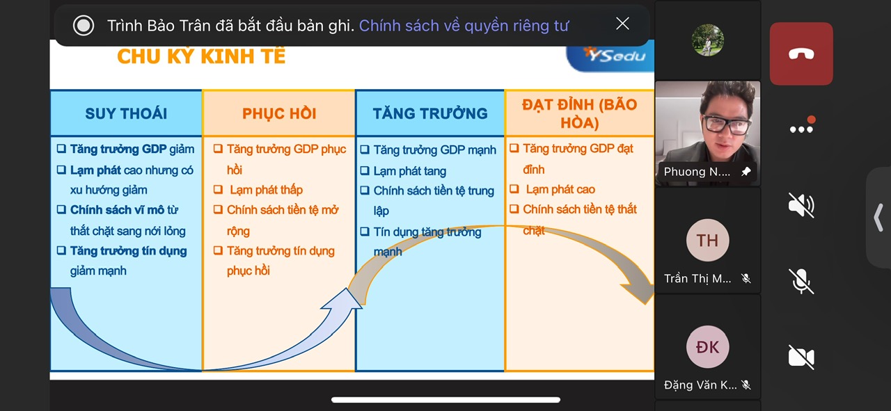 Nhằm giúp sinh viên khoa Tài chính ngân hàng, đặc biệt là sinh viên năm 3 (khóa 22D), hiểu rõ mối quan hệ giữa chu kỳ kinh tế và thị trường chứng khoán để áp dụng vào đầu tư; và trang bị cho sinh viên phương pháp phân tích chu kỳ kinh tế, quản lý rủi ro và dự đoán xu hướng thị trường, khoa Tài chính ngân hàng đã tổ chức buổi báo cáo chuyên đề “Thị trường chứng khoán - Ứng dụng phân tích chu kỳ kinh tế vào hoạt động đầu tư” vào sáng 19/10/2024 thông qua phần mềm MS. Team.