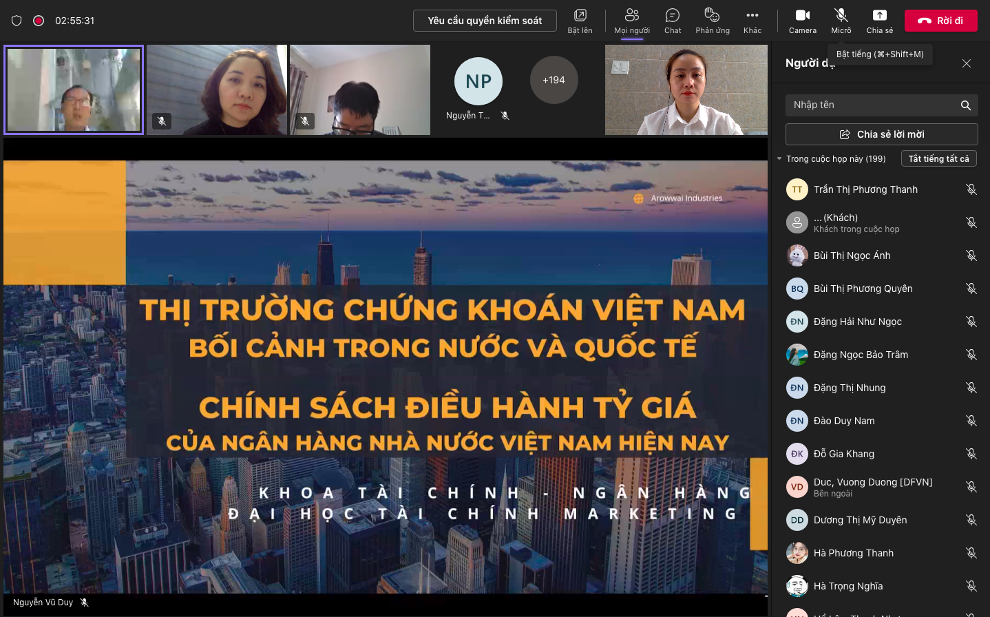 Với mục tiêu đào tạo theo định hướng ứng dụng, trường đại học Tài chính – Marketing nói chung và Khoa Tài chính – Ngân hàng nói riêng luôn cố gắng tạo môi trường học tập năng động nhất giúp các em Sinh viên tiếp cận với kiến thức thực tế. Để làm được điều này, Khoa Tài chính – Ngân hàng không ngừng tổ chức những chuỗi hoạt động kết nối giữa người học và doanh nghiệp, các chuyên gia kinh tế hàng đầu, một trong số đó là công tác tổ chức báo cáo chuyên đề. Bộ môn Ngân hàng vinh dự nhận được sự chỉ đạo từ BLĐ Khoa Tài chính – Ngân hàng chủ trì buổi báo cáo “Thị trường chứng khoán Việt Nam – bối cảnh trong nước và quốc tế” và “Chính sách điều hành tỷ giá của Ngân hàng Nhà nước Việt Nam” diễn ra vào ngày 5/11/2022 trên nền tảng Microsoft team.