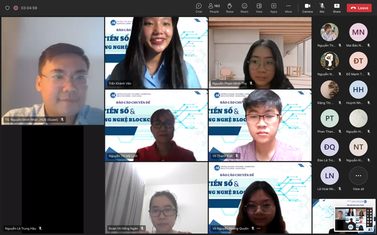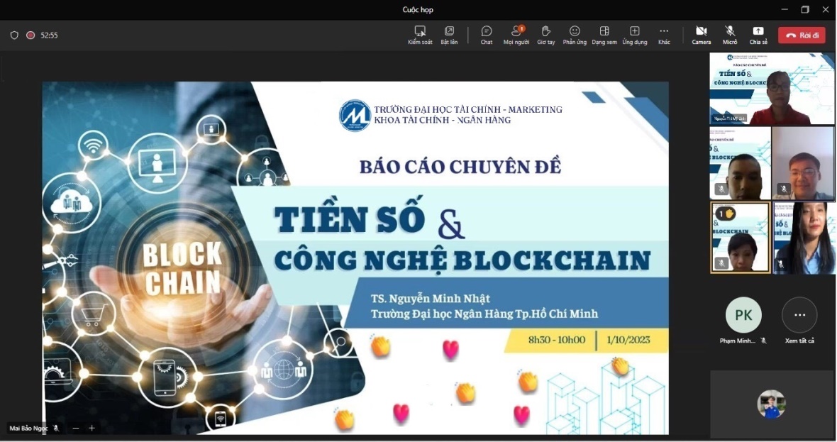 Nhằm tạo điều kiện cho các Giảng viên và Sinh viên tiếp cận những kiến thức mới, những kiến thức mang tính xu hướng cũng như học hỏi thêm được các kinh nghiệm đào tạo của các nước phát triển về lĩnh vực Fintech, ngày 1/10/2023, khoa Tài chính – Ngân hàng đã tổ chức buổi báo cáo chuyên đề “Tiền số và công nghệ Blockchain” dành cho các bạn sinh viên K20 thuộc Khoa Tài chính – Ngân hàng và các bạn sinh viên khóa khác có quan tâm. Báo cáo chuyên đề được tổ chức online trên nền tảng trực tuyến Microsoft Team, đã thu hút sự tham gia của hơn 300 sinh viên cùng Quý Thầy Cô là giảng viên của khoa Tài chính- Ngân hàng.