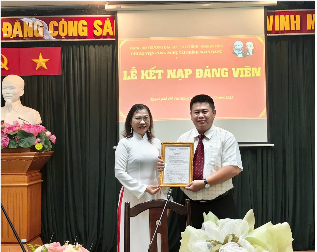Ngày 03/12/2025, Chi bộ Viện Công nghệ tài chính ngân hàng (CNTCNH), Trường Đại học Tài chính – Marketing đã long trọng tổ chức Lễ kết nạp Đảng viên mới cho quần chúng ưu tú Lê Võ Đại Hải. Buổi lễ được tiến hành trong không khí trang nghiêm, đúng trình tự, thủ tục theo Điều lệ Đảng Cộng sản Việt Nam.