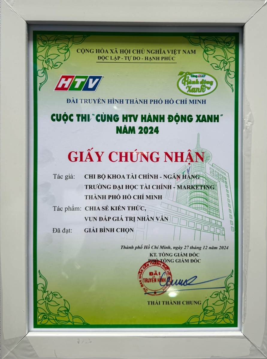 Hưởng ứng cuộc thi “Cùng HTV Hành động xanh” - chương trình do Đài Truyền hình TP.HCM tổ chức nhằm lan tỏa tinh thần hành động vì một tương lai xanh, sống có trách nhiệm với môi trường và cộng đồng, Chi bộ Khoa Tài chính – Ngân hàng đã tích cực tham gia bằng một sản phẩm video mang chủ đề “Chia sẻ kiến thức - Vun đắp giá trị nhân văn”, đồng thời để lại dấu ấn sâu sắc với những hành động thiết thực, đậm chất giáo dục và nhân văn.