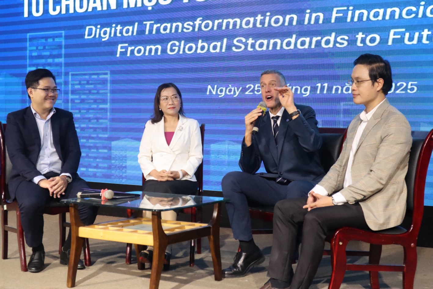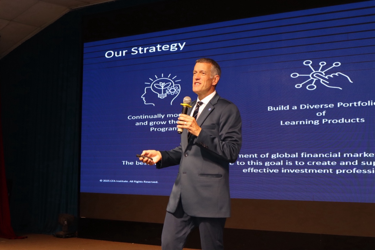 Đại diện CFA Institute, Ông Richard McGillivray, mở đầu hội thảo với chủ đề “Đạo đức nghề nghiệp và chuẩn mực toàn cầu trước làn sóng chuyển đổi số.” Trong phần chia sẻ, ông nhấn mạnh rằng các công nghệ mới như AI, Big Data và fintech đang tạo ra những thay đổi sâu rộng trong lĩnh vực đầu tư, nhưng đạo đức nghề nghiệp vẫn luôn là trụ cột không thể thay thế trong mọi hoạt động của ngành tài chính. Ông đồng thời khẳng định chứng chỉ CFA đóng vai trò then chốt trong việc giúp sinh viên tiếp cận các cơ hội nghề nghiệp toàn cầu một cách bền vững và chuyên nghiệp.
