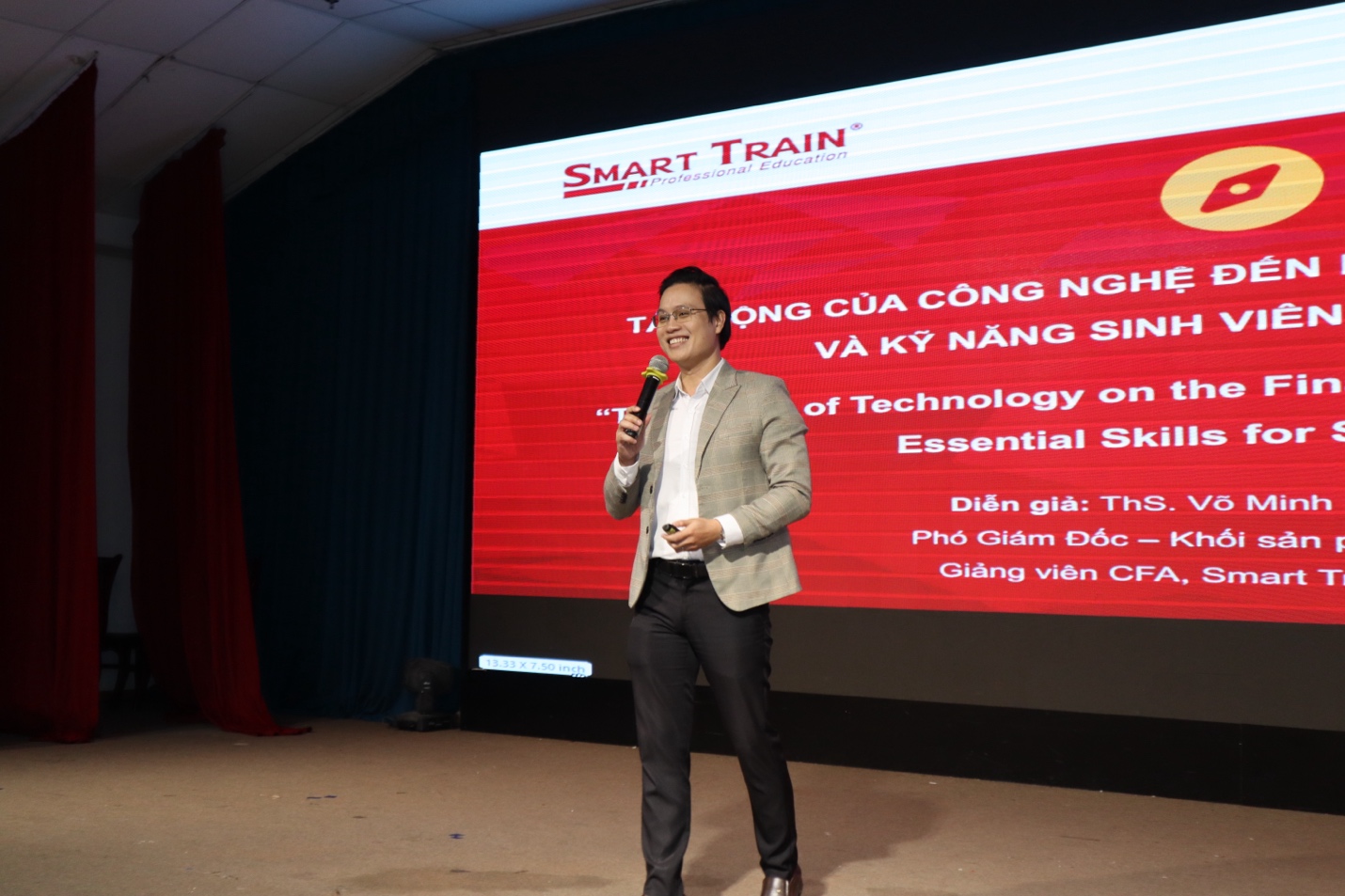 Đại diện Smart Train, ông Võ Minh Dương, Phó Giám đốc Khối Tài chính, đã mang đến cho sinh viên góc nhìn thực tiễn thông qua bài chia sẻ về các ứng dụng hiện đại trong ngành tài chính. Ông trình bày cách AI được sử dụng trong phân tích tài chính, vai trò của trí tuệ nhân tạo trong quản trị danh mục, cũng như nhấn mạnh những kỹ năng công nghệ bắt buộc mà sinh viên cần trang bị như data analytics, Python và Power BI. Những nội dung này phản ánh đúng xu hướng tuyển dụng hiện nay của các doanh nghiệp, giúp sinh viên hiểu rõ hơn về yêu cầu của thị trường và định hướng phát triển kỹ năng phù hợp.