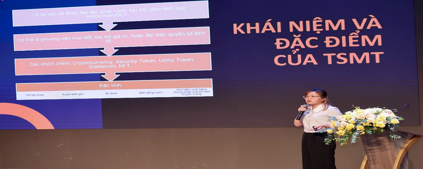 Hình 4: Th.S Lưu Ánh Nguyệt – Phó trưởng ban Phát triển thị trường tài chính, Viện Chính sách và Chính sách Kinh tế - Tài chính, Bộ Tài chính trình bày chủ đề “Chính sách thuế đối với tài sản mã hóa: Kinh nghiệm quốc tế và khuyến nghị cho Việt Nam” tại hội thảo.