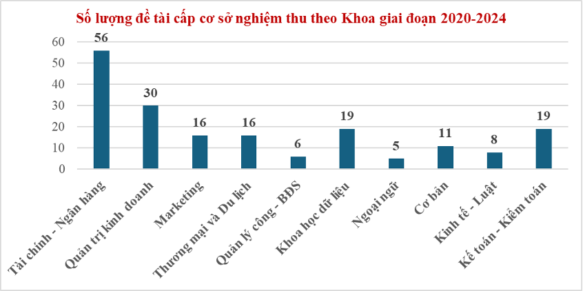 Theo số liệu thống kê về số lượng đề tài cấp cơ sở nghiệm thu trong giai đoạn 2020-2024, hoạt động nghiên cứu khoa học tại Khoa Tài chính – Ngân hàng dẫn đầu trong 10 Khoa chuyên môn với 56 đề tài (chiếm gẩn 30% tổng số đề tài toàn Trường). Hơn nữa, số đề tài của Khoa có xu hướng tăng mạnh qua từng năm, đặc biệt trong giai đoạn 2023-2024 (tăng từ 15 đề tài/năm đến 22 đề tài/năm). Điều này cho thấy Khoa đã và đang phát huy thế mạnh nghiên cứu chuyên môn, có lực lượng giảng viên đóng vai trò nòng cốt trong hoạt động KH&CN của Trường.