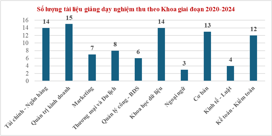 Bên cạnh đó, việc biên soạn tài liệu giảng dạy của Khoa Tài chính – Ngân hàng trong giai đoạn 2020-2024 cũng đạt được thành tích nổi bật, với số lượng tài liệu cao, đa dạng và phân bố đều qua các năm. Điều này phản ánh sự chủ động của Khoa trong việc cập nhật học liệu, gắn kết giữa lý thuyết và thực tiễn, đáp ứng nhu cầu đào tạo.