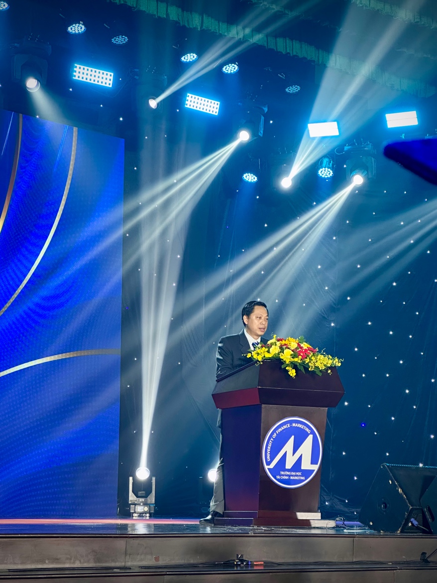 Hình 1: Đại diện Ban Giám hiệu – TS. Lê Trung Đạo, Phó Hiệu trưởng Trường Đại học Tài chính – Marketing phát biểu mở đầu buổi lễ.