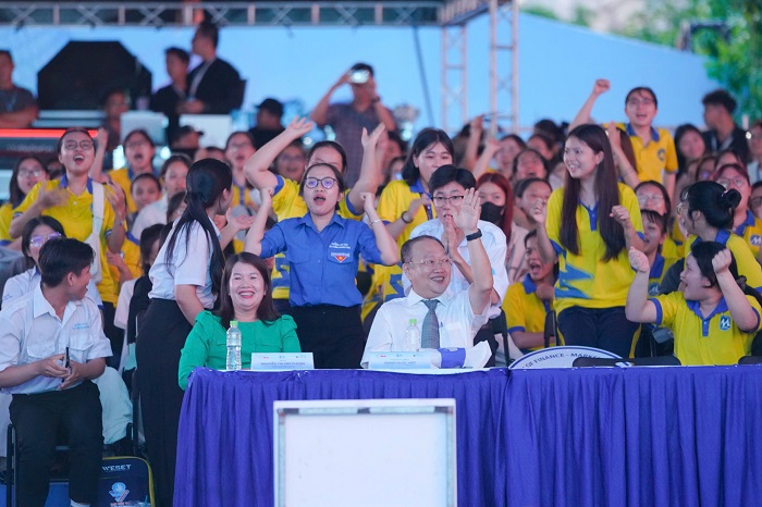 Hình 2: PGS.TS Phạm Quốc Việt, Phó Hiệu trưởng và ThS. Nguyễn Thị Kim Phụng, Phó Trưởng phòng Tuyển sinh, Truyền thông và Quan hệ doanh nghiệp tham dự chương trình, cùng các bạn sinh viên UFM cổ vũ nhiệt tình