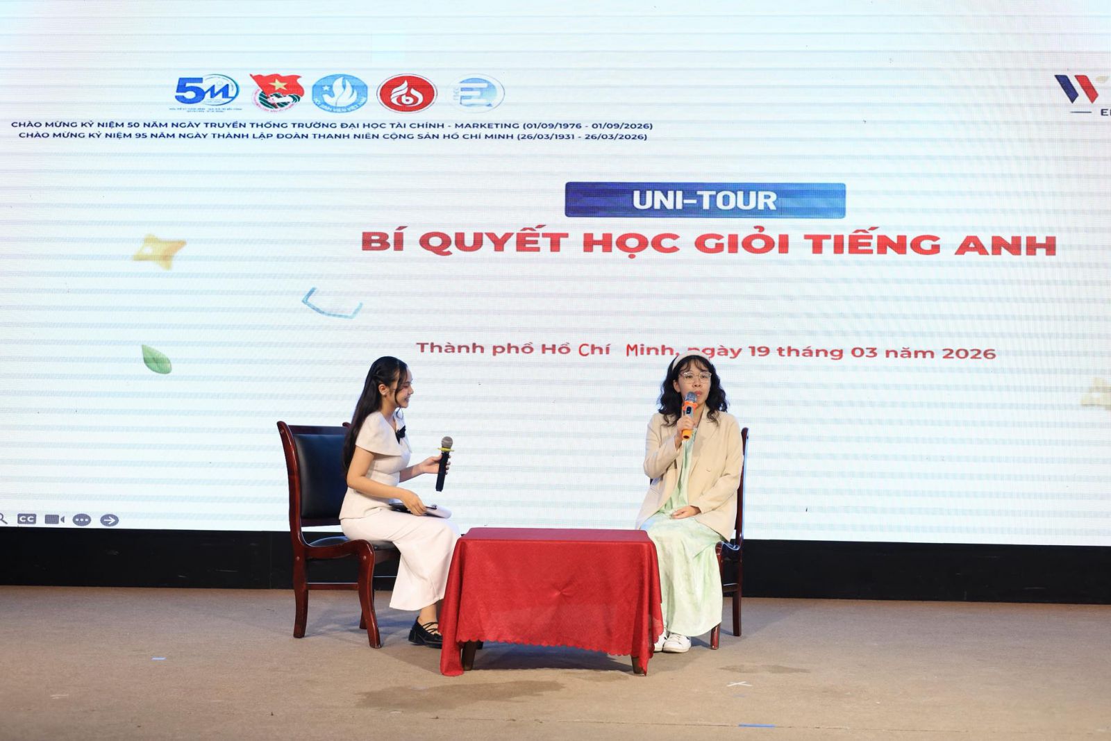 Vào chiều ngày 19/03/2026, tại Hội trường A.701 – Cơ sở Tân Thuận, Trường Đại học Tài chính – Marketing, talkshow với chủ đề “Bí quyết học giỏi tiếng Anh cùng sinh viên UFM” đã diễn ra thành công tốt đẹp, thu hút sự tham gia của hơn 500 sinh viên. Chương trình có sự đồng hành của WESET English Center và được tổ chức bởi Câu lạc bộ Tiếng Anh thuộc Viện Công nghệ Tài chính – Ngân hàng. Trong bối cảnh hội nhập quốc tế ngày càng sâu rộng, tiếng Anh không chỉ là một kỹ năng bổ trợ mà đã trở thành yếu tố quan trọng giúp sinh viên nâng cao năng lực cạnh tranh trong học tập và nghề nghiệp. Chính vì vậy, talkshow được tổ chức với mong muốn mang đến những góc nhìn thực tế, phương pháp học hiệu quả và nguồn cảm hứng giúp sinh viên chủ động hơn trên hành trình chinh phục ngoại ngữ.
