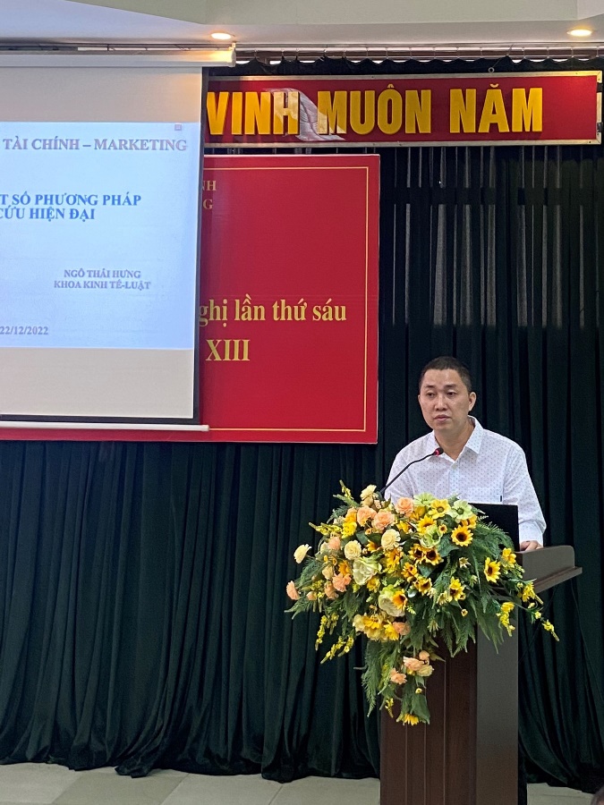 Trình bày đầu tiên là bài tham luận của TS. Ngô Thái Hưng với chủ đề “Giới thiệu một số phương pháp nghiên cứu hiện đại”. TS. Ngô Thái Hưng là tiến sĩ ngành tài chính tốt nghiệp tại Corvinus University of Budapest, Hungary và là nhà nghiên cứu có nhiều kinh nghiệm với hơn 20 bài báo được đăng trên nhiều tạp chí quốc tế xếp thứ hạng cao thuộc danh mục ISI/Scopus. TS. Ngô Thái Hưng chia sẻ định hướng cách chọn đề tài nghiên cứu trong nghiên cứu thực nghiệm cho những nhà nghiên cứu mới bắt đầu nhằm tăng khả năng được đăng tải trên các tạp chí uy tín quốc tế.