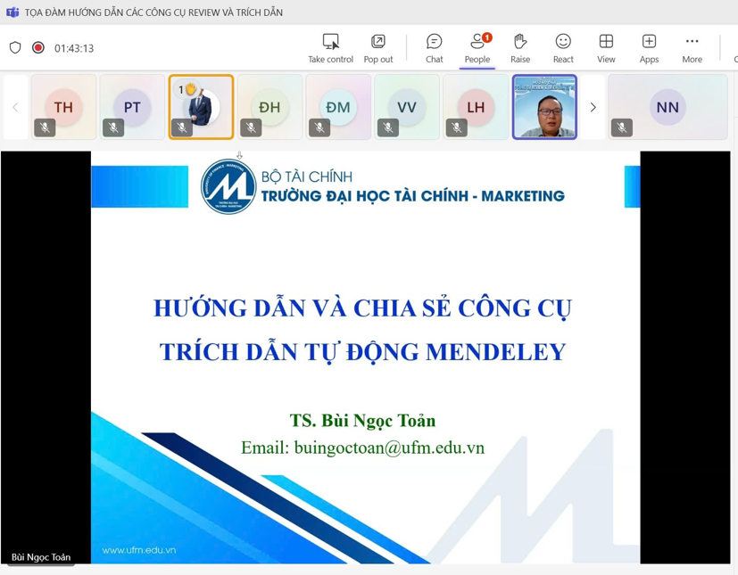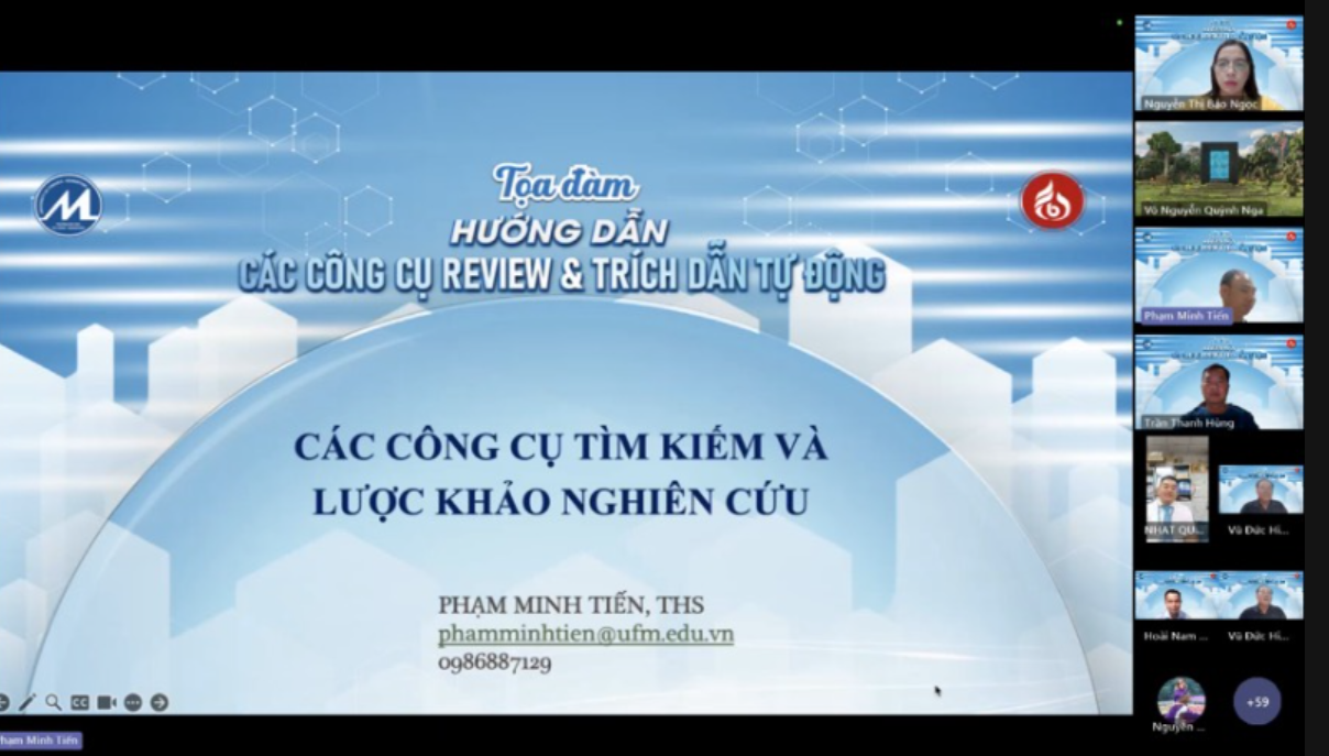 Nhằm hỗ trợ các học viên cao học nâng cao kỹ năng nghiên cứu khoa học đặc biệt là việc tìm tài liệu nghiên cứu, quản lý tài liệu, trích dẫn chính xác và đảm bảo tính nhất quán trong quá trình học tập, thực hiện luận văn và viết các bài báo cáo khoa hoc, Khoa Tài chính - Ngân hàng (TCNH), Trường Đại học Tài chính – Marketing đã tổ chức tọa đàm với chủ đề “Hướng dẫn các công cụ review và trích dẫn tự động” vào lúc 19h00 ngày 10/05/2025. Tọa đàm được điều hành bởi PGS.TS Nguyễn Thị Mỹ Linh – Trưởng khoa Tài chính - Ngân hàng, với sự tham gia của hai diễn giả là TS. Bùi Ngọc Toản, giảng viên khoa TCNH và Ths. Phạm Minh Tiến, chuyên viên Phòng Quản lý khoa học – Hợp tác quốc tế.