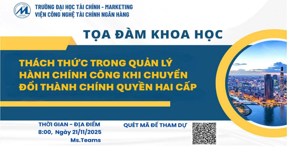 Sáng ngày 21/11/2025, Viện Công nghệ tài chính ngân hàng, Trường Đại học Tài chính – Marketing, đã tổ chức buổi Tọa đàm khoa học với chủ đề “Thách thức trong quản lý tài chính công khi chuyển đổi thành chính quyền hai cấp” theo hình thức trực tuyến trên nền tảng MS Teams.