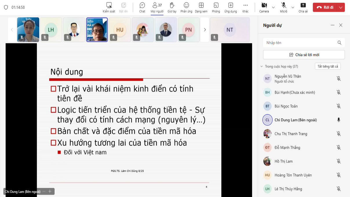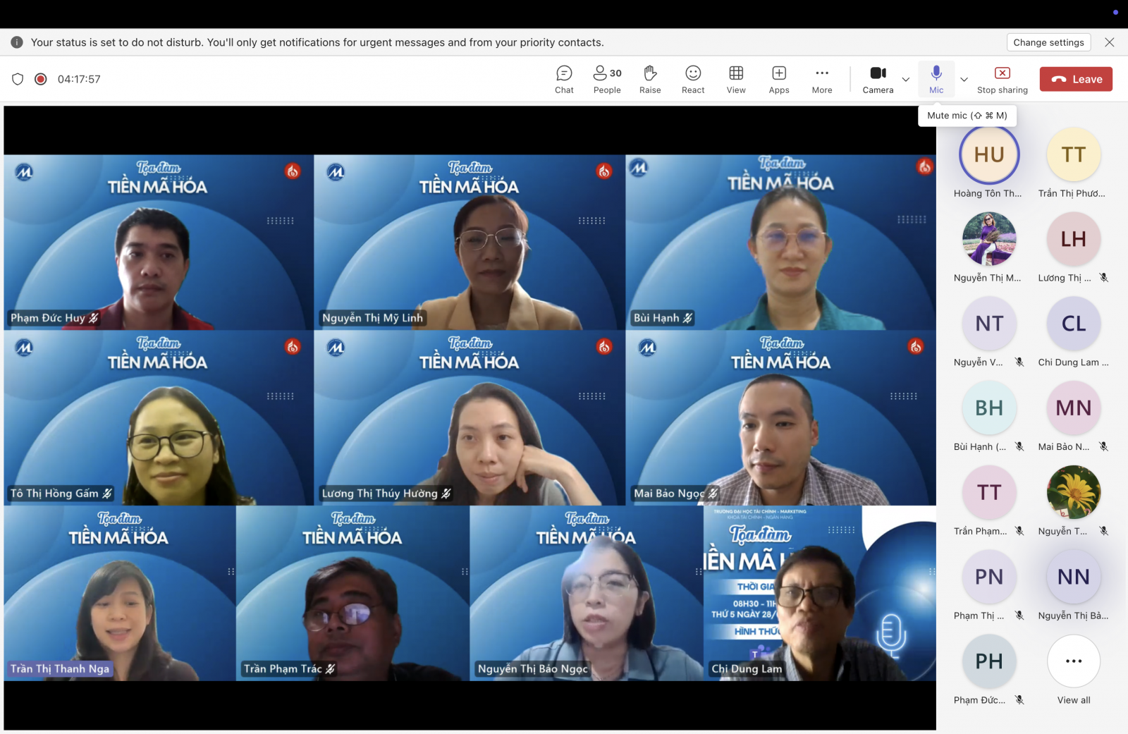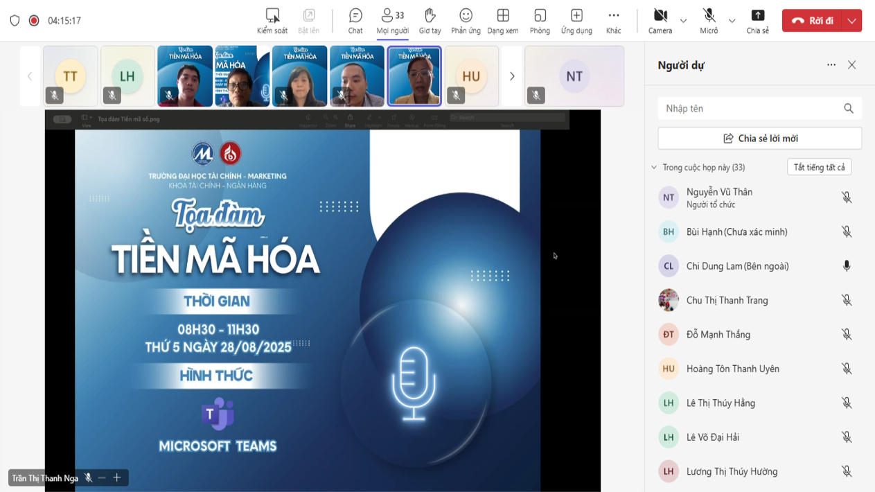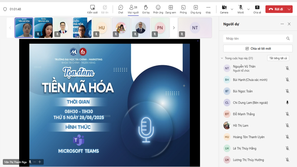 Ngày 28/08/2025, Viện Công nghệ tài chính ngân hàng, Trường Đại học Tài chính – Marketing đã tổ chức tọa đàm khoa học trực tuyến với chủ đề “Tiền mã hóa và các xu hướng tương lai”. Chương trình được thực hiện trên nền tảng MS Teams với sự tham dự của Ban lãnh đạo Viện, các giảng viên và khách mời quan tâm.