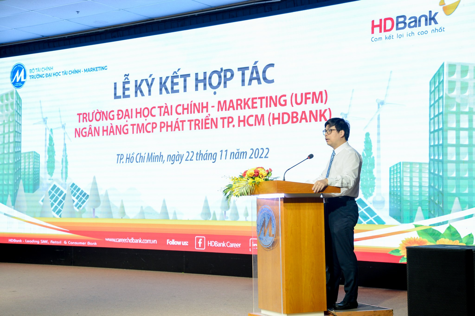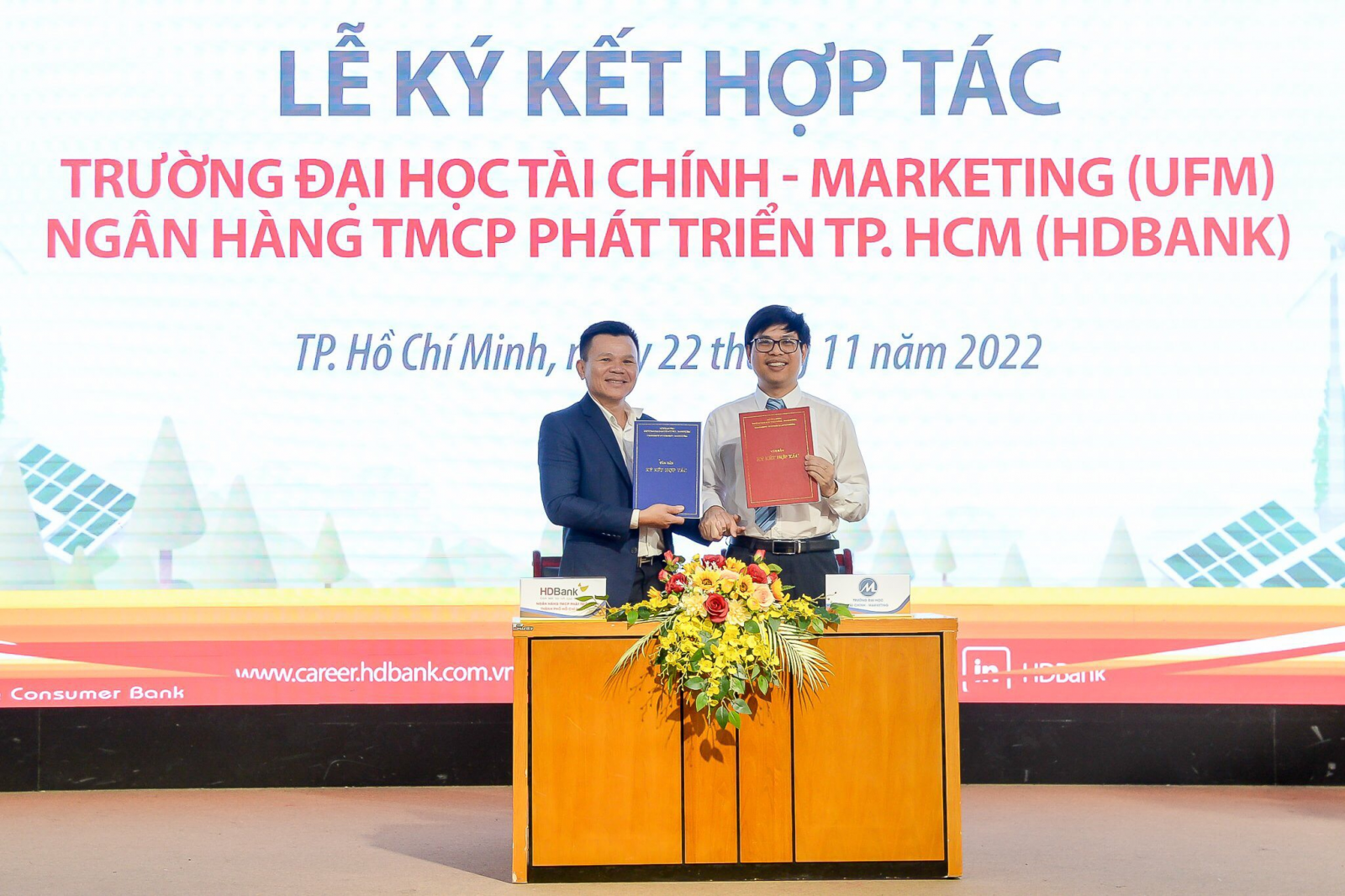 Ngày 22/11/2022, Trường Đại học Tài chính – Marketing (UFM) đã tổ chức Lễ ký kết hợp tác với Ngân hàng TMCP Phát triển Thành phố Hồ Chí Minh (HDBank). Tham dự buổi lễ có sự hiện diện của Ông Trần Văn Hướng, Giám đốc khu vực Tp.HCM, Ngân hàng HD Bank; PGS.TS Phạm Tiến Đạt, Hiệu trưởng UFM cùng lãnh đạo các đơn vị trực thuộc 2 đơn vị.