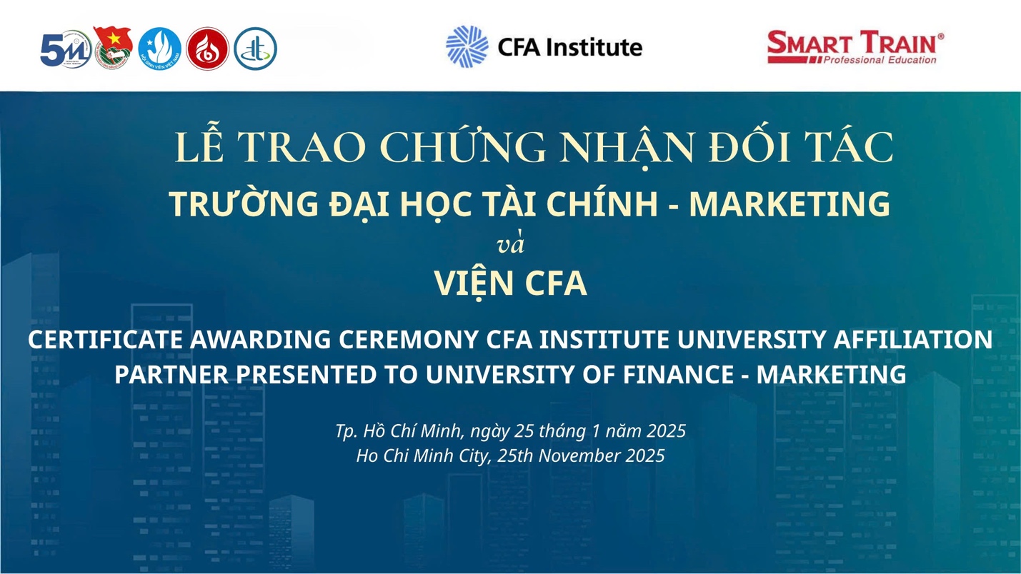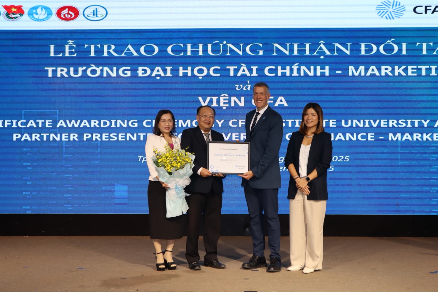 Ngày 25/11/2025, trong không khí trang trọng tại Hội trường lầu 7, cơ sở 27 Tân Mỹ, Trường Đại học Tài chính – Marketing (UFM) đã long trọng tổ chức Lễ trao Giấy chứng nhận Đối tác của CFA Institute (Hoa Kỳ) cho chương trình đào tạo Ngành Tài chính – Ngân hàng. Buổi lễ đánh dấu một cột mốc chiến lược, khẳng định chất lượng đào tạo của UFM chính thức được công nhận theo chuẩn quốc tế CFA, bộ tiêu chuẩn toàn cầu về đầu tư tài chính.